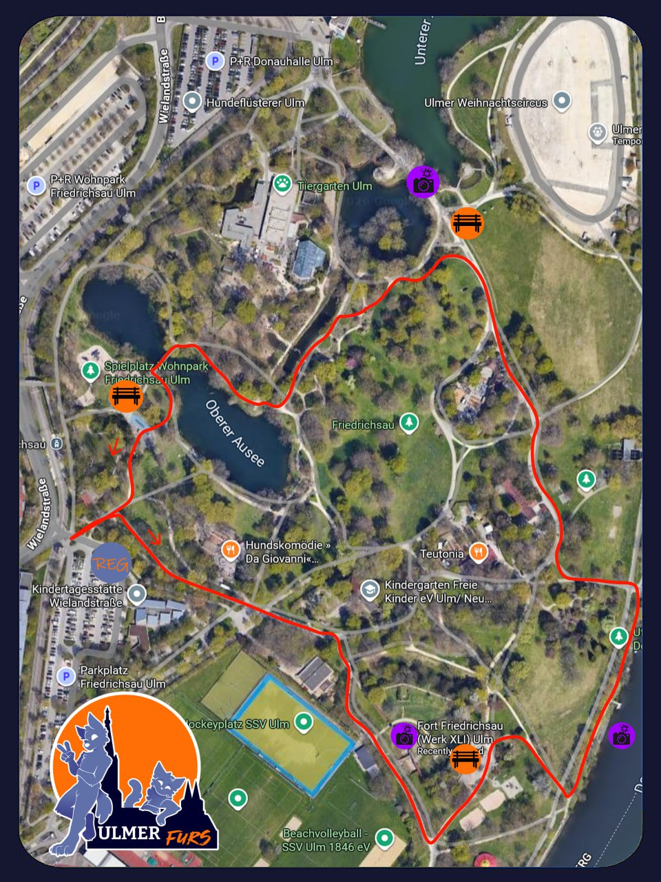 Danach geht es zu Steg am Donauufer wo wie ein großes Gruppenbild machen werden. Danach geht es weiter durch die Friedrichsau in Richtung Tiergarten. Bei einer Wiese ist die nächste Pause. Wer Interesse hat, kann dort mit ebenfalls ein paar gute Fotos erhaschen. Der Letzte Teil der Route ist am Tierpark vorbei zum Spielplatz Wohnpark. Der Parkplatz von dem wir gestartet sind ist direkt in der Nähe. Entsprechend können einige auch schon früher zum Auto gehen und wer möchte noch etwas beim Spielplatz verweilen.